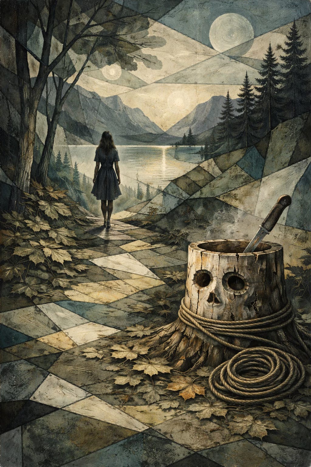 We take a remote walk into the forest and hike up a ridge. I locate the most magnificent view—where one can see beyond yonder. There’s a large lake too, and forest filled mountains that all sit underneath a vast sky. It is here I secure you to a tree, hidden, never to be discovered. I curse you to an evermore of sunrises, the moon and stars after nightfall, alone. You will see, hear, and smell all of life but never participate. When you speak, there will be none to listen. No one will know of your existence. This is to be your permanent confines.